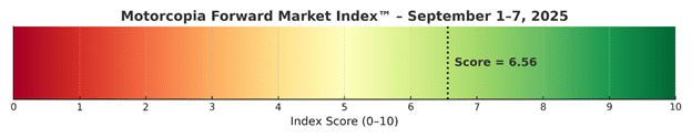 The Motorcopia Forward Market Index™ score of 6.56 signals a cautiously but slightly growing bullish outlook for the September 1 to September 7 week and the rest of summer 2025 in the collector car market. Post-Monterey Car Week optimism remains intact, supported by solid upcoming auction-consignment quality and volume. While macro and geopolitical risks still cast shadows, buyer confidence – particularly among well-capitalized enthusiasts – suggests selective activity will increase as the fall auction calendar unfolds. Online listings and search data also imply that strategic buyers are actively preparing for Q4 opportunities. Expect continued upward traction for rare, low-mileage, investment-grade vehicles.