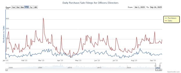 Every week, executives, directors, and large shareholders at public companies file Form 4 reports when they buy or sell stock in their own firms. Sites like OpenInsider aggregate this data, producing charts that reveal whether insiders are accumulating shares (confidence) in their company, or cashing out of their company’s stock, signaling caution or a swing in sentiment toward diversification.