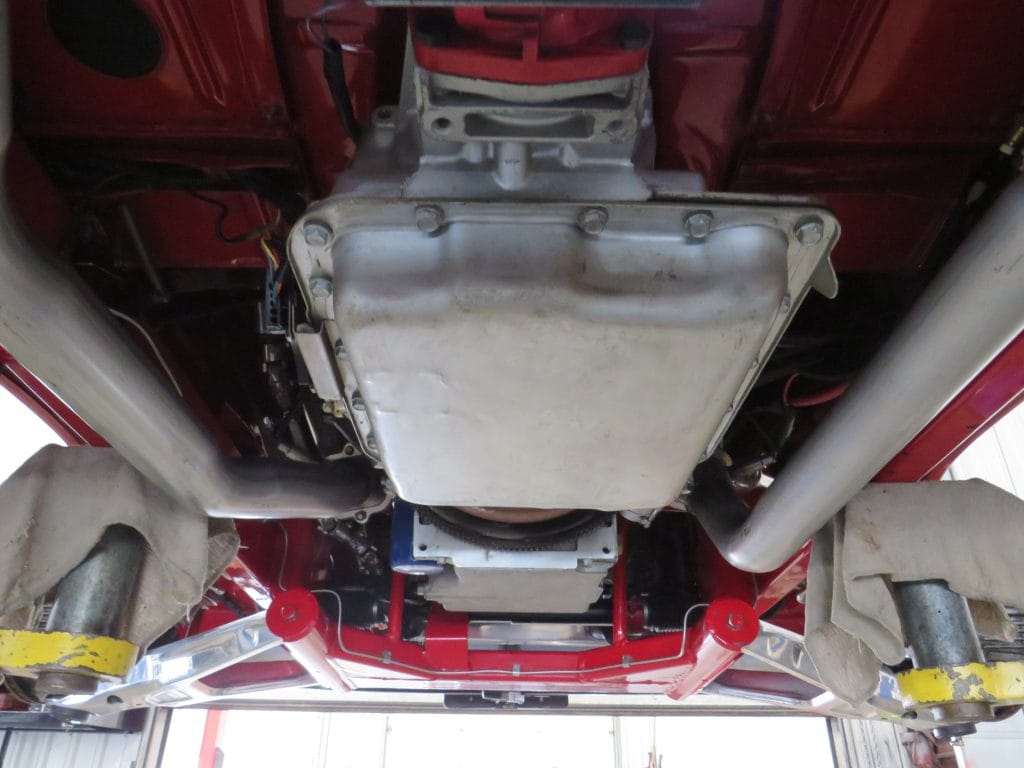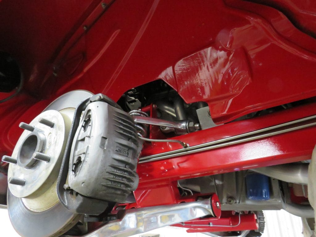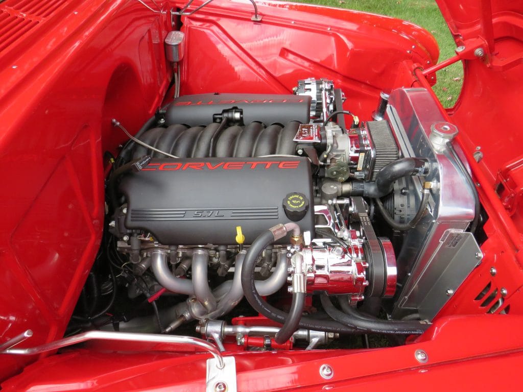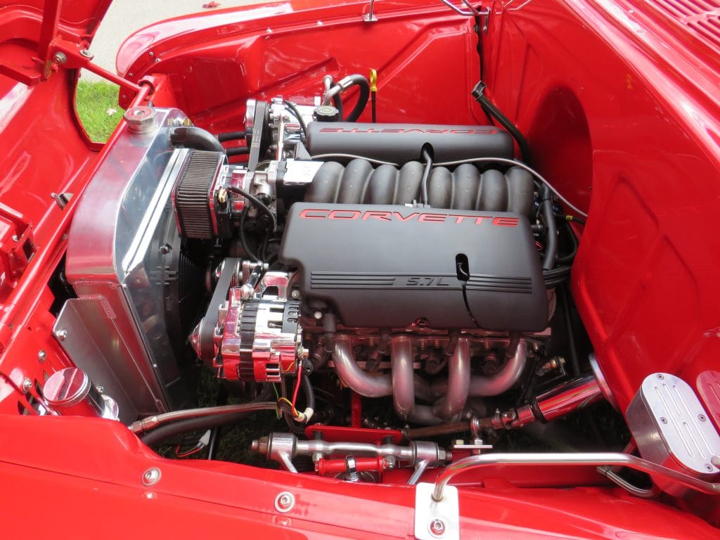 Power comes from a GM LS1 crate V-8 with electronic fuel injection, breathing through Jet-Hot-coated block-hugger headers. Additional highlights include a serpentine front-runner accessory drive, Street & Performance wiring, a 3–speed automatic transmission, and 4-wheel disc brakes.