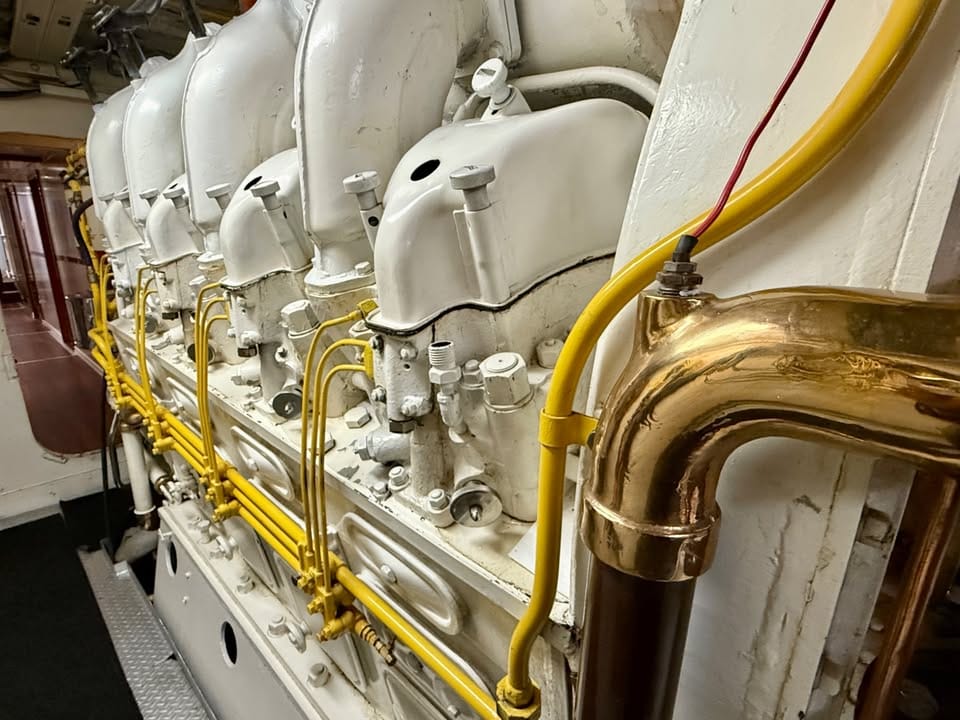Powering the vessel is a GM Cleveland 8V 278A 2-stroke diesel engine with closed cooling and approximately 1,800 running hours. Power is rated at 600 horsepower. Rightly considered one of the finest marine engines ever produced, the Cleveland 8V 278A traces its lineage to the Winton Gas Engine and Manufacturing Company founded by early Cleveland, Ohio automobile manufacturer Alexander Winton in 1912. This highly successful company was eventually purchased by General Motors in June 1930 and in 1938, renamed the Cleveland Diesel Engine Division of General Motors Corporation. The Model 278A design was incredibly flexible, offered in 6, 8, 12, and 16-cylinder versions, suited to a huge array of applications. This design remains a company signature, and its importance cannot be overstated, having powered many of America’s surface and submarine combat ships of WW II, plus cargo ships, tenders, and tugboats.