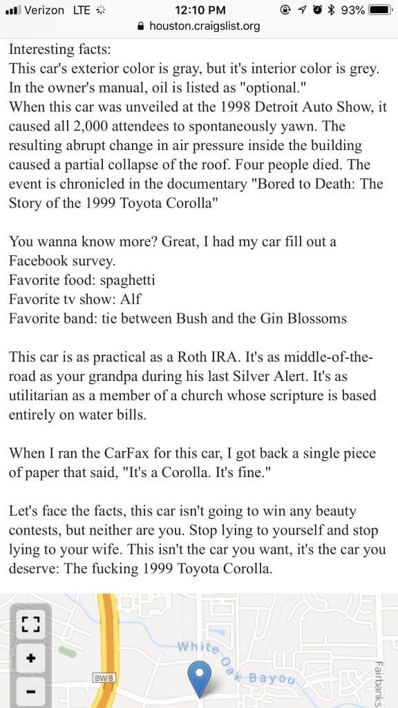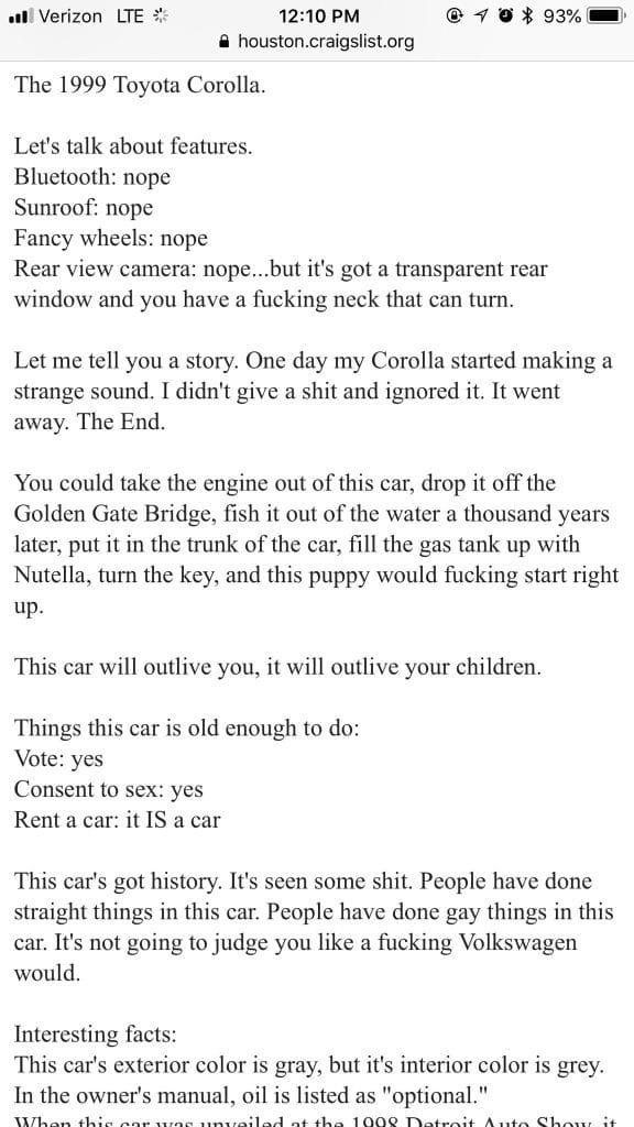 We must have been working really, really hard or living under a proverbial rock back in 2018 when this Houston Craigslist For Sale ad was posted for a certain and otherwise unremarkable 1999 Toyota Corolla. While we clearly missed it when live, the internet generally went ballistic over its unusual blend of candor, hyperbole and humor.